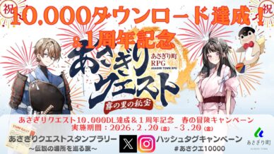 お知らせ あさぎりクエスト1万ダウンロード達成&1周年記念 あさぎりクエストスタンプラリー ~伝説の場所を巡るゲーム内に登場するスポットや町の名所を実際に巡るスタンプラリーを開催します。【参加方法】スタンプ台紙を受け取り、参加する【スタンプ設置場所(全8箇所)... 2026.02.18 お知らせ